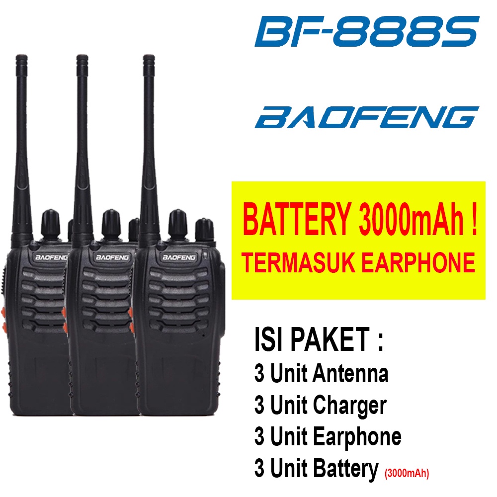 Yang ada di dalam dus : - 3 x HT BF-888S - 3 x Baterai 3000mAh - 3 x Antena - 3 x Belt Clip - 3 x Desktop Charger - 3 x Earphone - 3 x Hand Strap - 3 x Manual Book