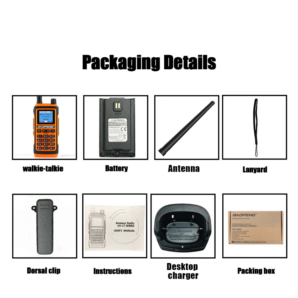 Menggunakan LCD sebesar 1.77-inch sebagai tampilan layar dan daya output yang besar menjadikan UV-17 ini bisa digunakan untuk jarak antara 2-5 km (tanpa halangan).