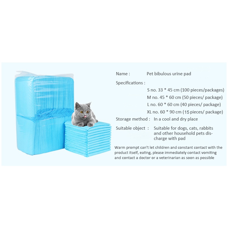 Jenis: popok pelatihan hewan peliharaan Bahan: kain bukan tenunan + molekul penyerap air Fitur: nyaman, praktis, multifungsi Ukuran: (S) 33 x 45cm (M) 45 x 60cm (L) 60 X 60cm (XL) 60 x 90cm