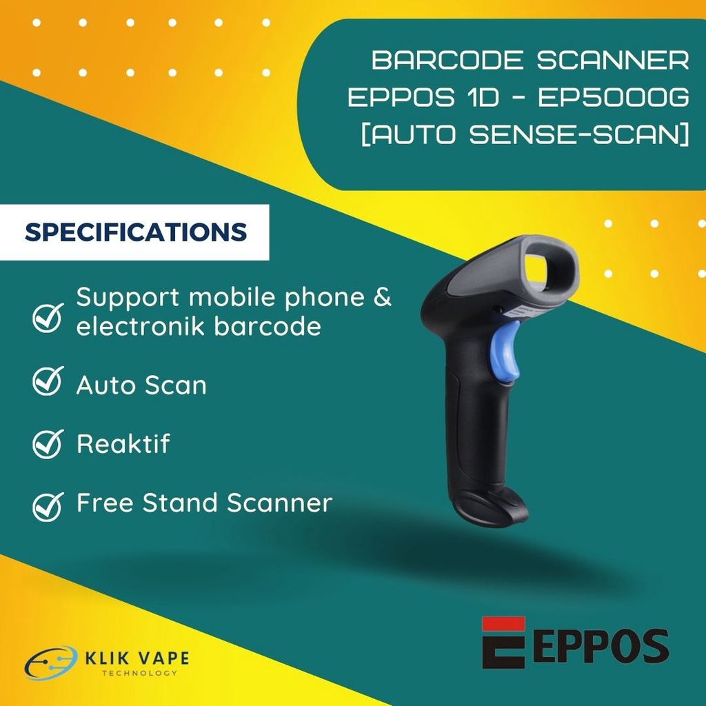 Barcode Scanner EPPOS 1D - EP5000G [Auto Sense-Scan] adalah perangkat barcode scanner dengan harga yang paling murah dan ekonomis. Memiliki tingkat pembacaan dan bisa di handalkan, barocde scanner sangat cocok untuk kasir dengan tingkat scanning item produk yang tidak terlalu banyak dan padat. Jika anda membutuhkan barcode scanner dengan kemampuan scan dan kemampuan auto scanner anda bisa membeli barcode scanner laser.