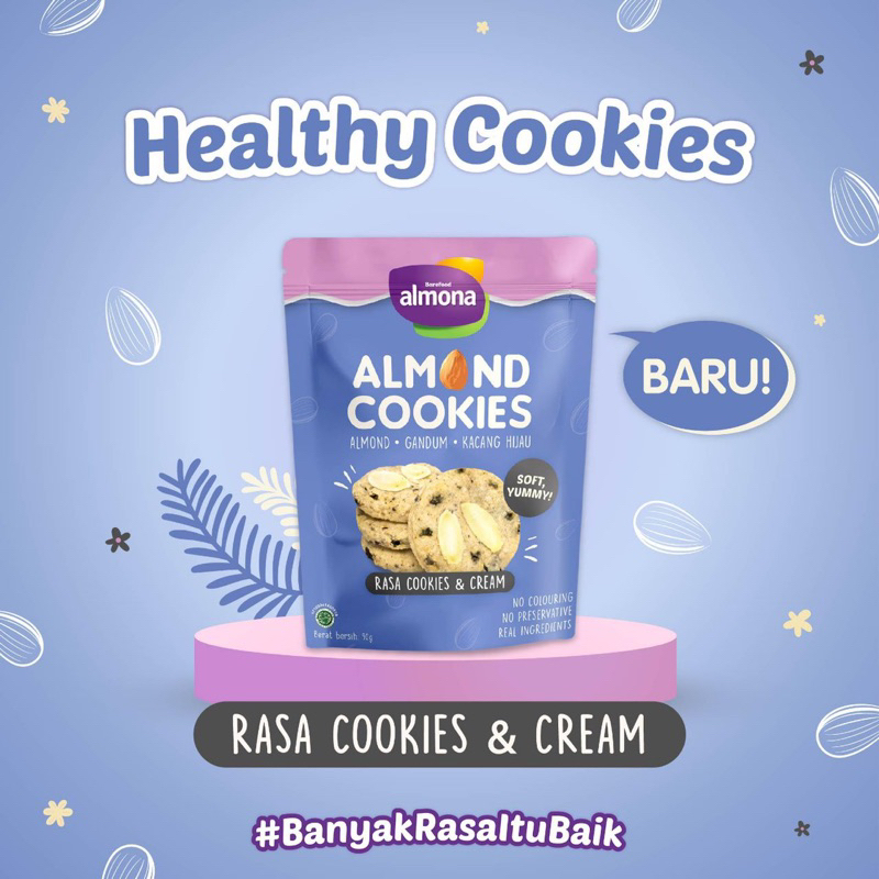Apa keunggulan ALMONA Almond Cookies dibandingkan cookies sehat lain? 1. Dibuat dari 3 SUPER FOOD: almond, gandum, dan kacang hijau 2. Tinggi asam folat 3. Mengandung 9 vitamin tambahan, seperti vitamin C, E, D, B6, dan B12. 4. Tiddak mengandung produk sapi atau telur 5. Tidak mengandung pengawet ataupun pewarna sintetis.