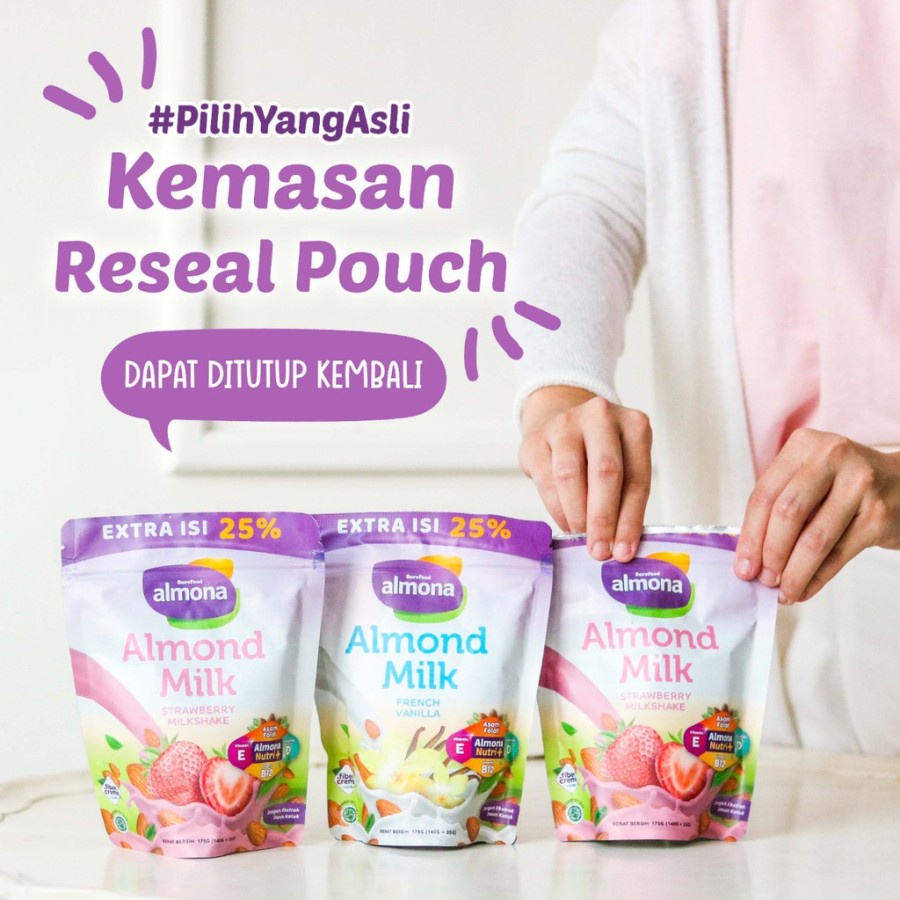Apa bedanya ALMONA dengan susu bubuk almond lain? 1. ALMOND HALUS - tidak kasar saat ditelan seperti banyak minuman almond lain. 2. DAUN KATUK - terbukti meningkatkan volume ASI sebanyak 50%. Baca riset lengkapnya di barefood.co.id/almona. 3. LESS SUGAR - mengandung 50% gula lebih rendah dibandingkan susu bubuk lain. 4. TINGGI SERAT - mengandung serat setara dengan 12 butir almond per sachet ALMONA. 5. TINGGI VITAMIN E - mengandung vitamin E setara dengan 7 buah jeruk per sachet ALMONA. 6. DAIRY FREE - tidak mengandung susu sapi atau produk turunannya.