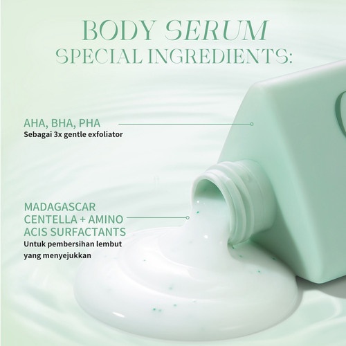 Body wash beraroma amber vanilla yang diperkaya dengan AHA, BHA, PHA, Amino Acid Surfactants, dan Madagascar Centella yang membantu merawat dan mencegah kulit tubuh yang berjerawat.