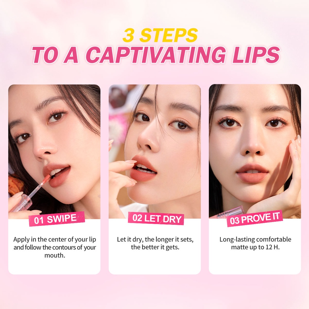 Matte tint dengan tekstur creamy yang ringan dan nyaman memberikan hasil yang transferproof dan tahan lama.