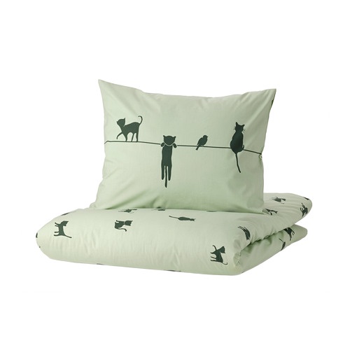 Detail BARNDROM Sarung quilt dan sarung bantal motif kucing hijau 150x200/50x80 cm