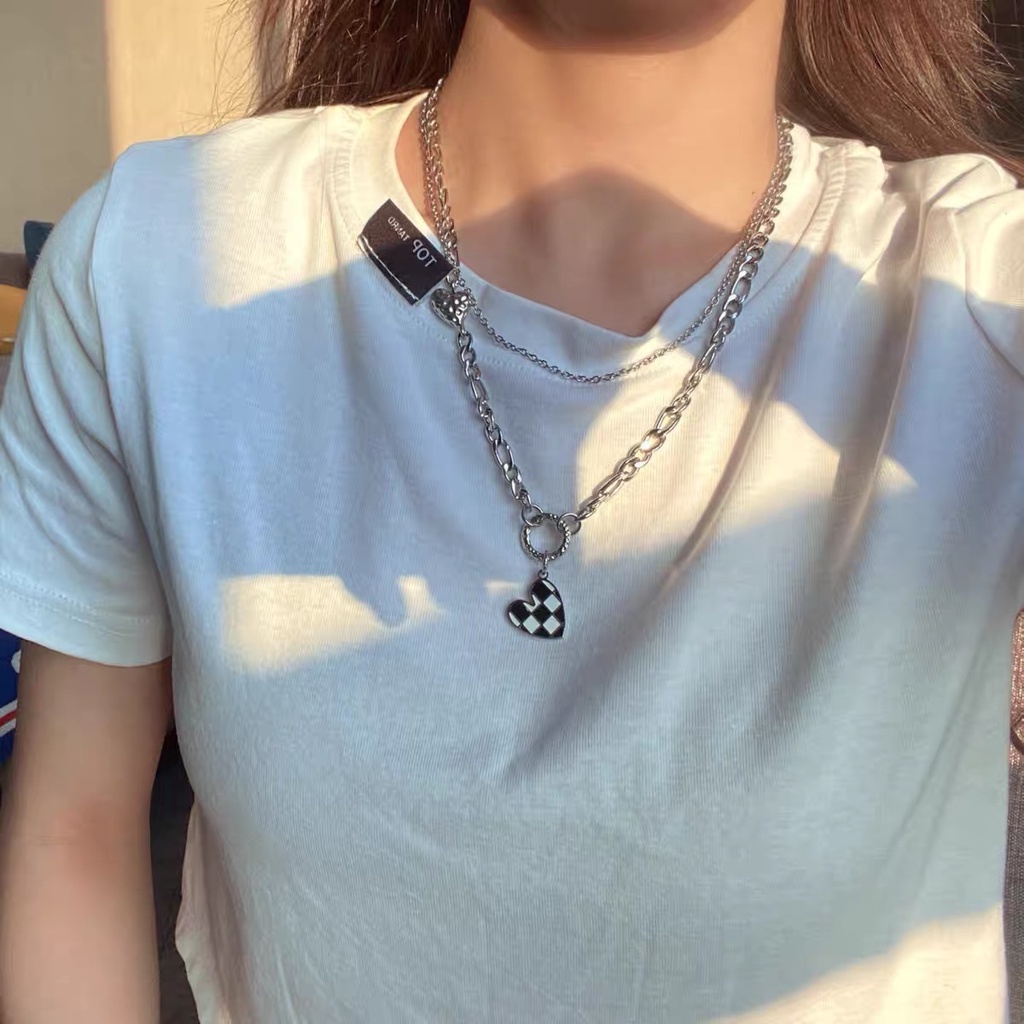 Detail Baru musim gugur hitam dan putih kotak-kotak liontin hati double-layer kalung untuk wanita ins gaya