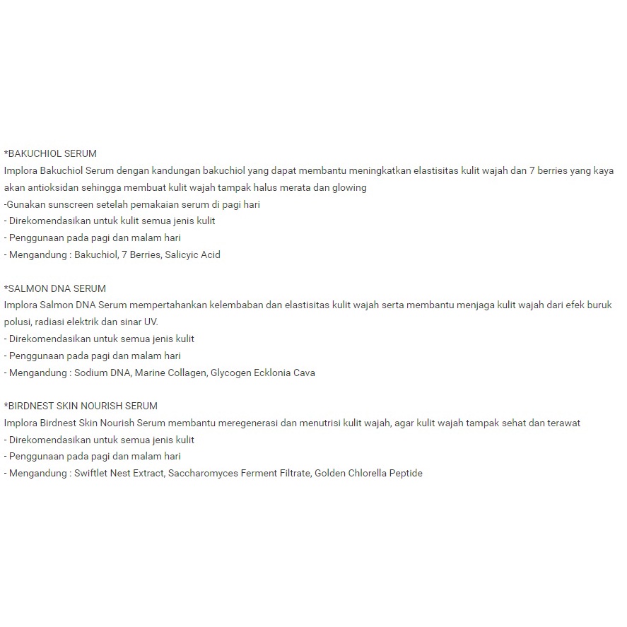 Implora Midnight Serum mengurangi beberapa tanda penuaan diri pada wajah. Membantu menutrisi kulit, melembabkan serta menyamarkan noda hitam di wajah. Maksimalkan tampilan kulit yang terlihat lebih cerah, sehat dan kencang dengan penggunaan secara teratur. Penggunaan malam hari, Direkomendasikan untuk semua jenis kulit - Mengandung : Galactomyces, Pea Protein Hamamelis Virginiana Coriandrum Sativum