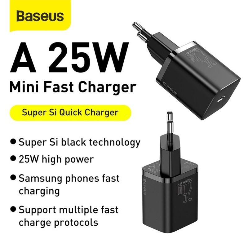 Isi paket: 1* Baseus Super Si Quick Charger 1C 25W 1* Mini White Kabel Type-C to Type-C 3A 1m