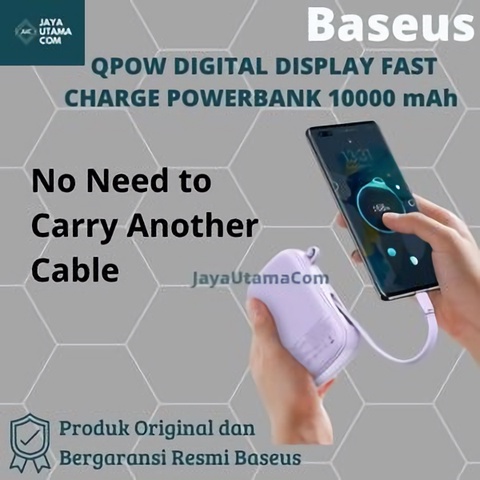 Spesifikasi: Brand : Baseus Name : Qpow Power Bank USB-C cable Model : PPQD0201010 Battery type : Polymer Energy Efficiency : ≥75% Ip input 5V/2A, 9V/2A USB-C Input 5V/3A, 9V/2A USB Output 4.5V/5A (SCP), 5V/4.5A (SCP), 5V/3A, 9V/2A, 12V/1.5A USB-C output 5V/3A, 9V/2.22A, 12V/1.5A USB-C cable output 4.5V/5A (SCP), 5V/4.5A (SCP), 5V/3A, 9V/2A, 12V/1.5A Total output current 5V/3A Weight 360g Dimensions 123 x 74.6 x 32.8 mm Cable length 19 cm READY WARNA FOR TYPE C : #BLACK (PPQD020101) #WHITE (PPQD020102) #BLUE (PPQD020103) #PURPLE (PPQD020105)