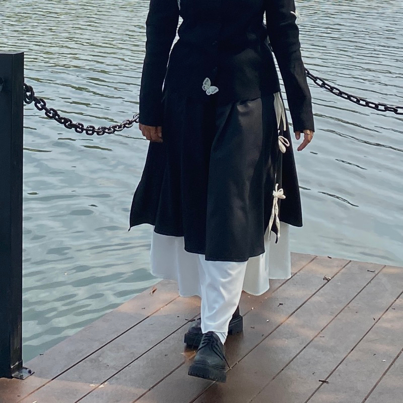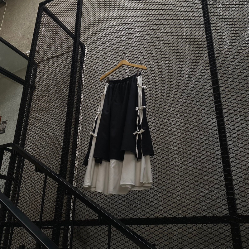 memiliki detail layer dengan warna yang berbeda dan pita di setiap potongan di bagian kanan dan kiri, dengan paduan warna yang basic hitam dan putih skirt lavye memiliki