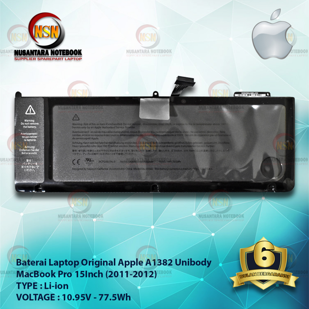 Baterai A1382 Unibody Mac Pro 15 Inch 2011-2012 10.95V 77.5WhBaterai A1382 Unibody Mac Pro 15 Inch 2011-2012 10.95V 77.5WhBaterai A1382 Unibody Mac Pro 15 Inch 2011-2012 10.95V 77.5Wh