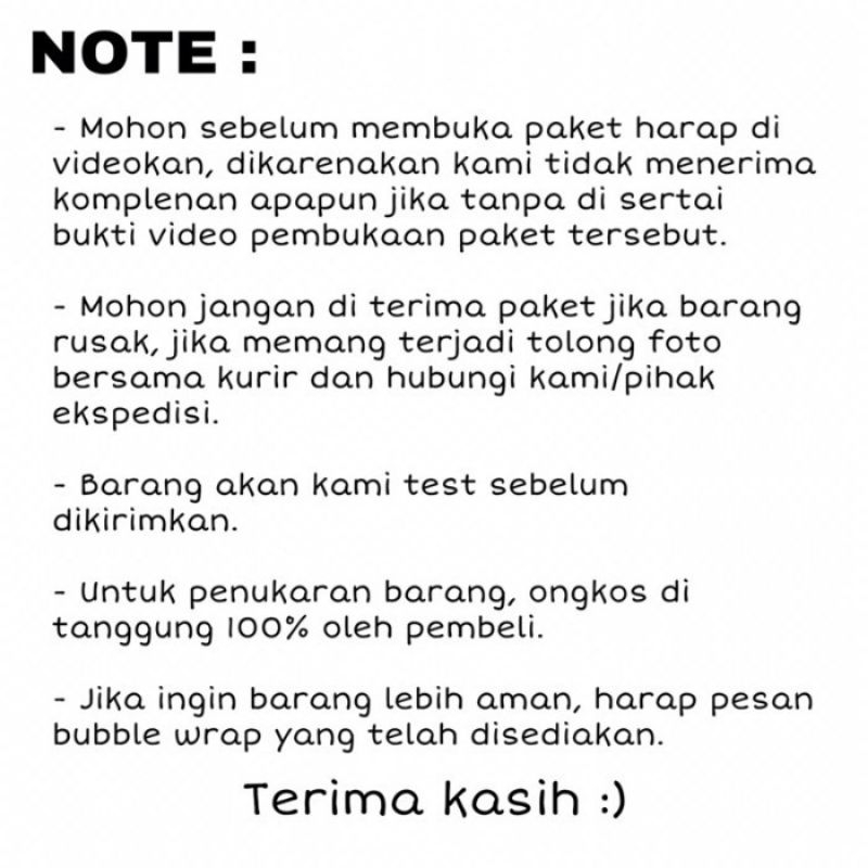 ‐----‐----------------------------------------------------------------------------------- (NOTE PENTING = JIKA BARANG KURANG KARNA KESALAHAN KAMI 100% KAMI AKAN TANGGUNG JAWAB.HARAP DISERTAKAN VIDEO PEMBUKAAN PAKET.KARNA KAMI TIDAK MENERIMA KOMPLAIN TANPA VIDEO UNBOXING)