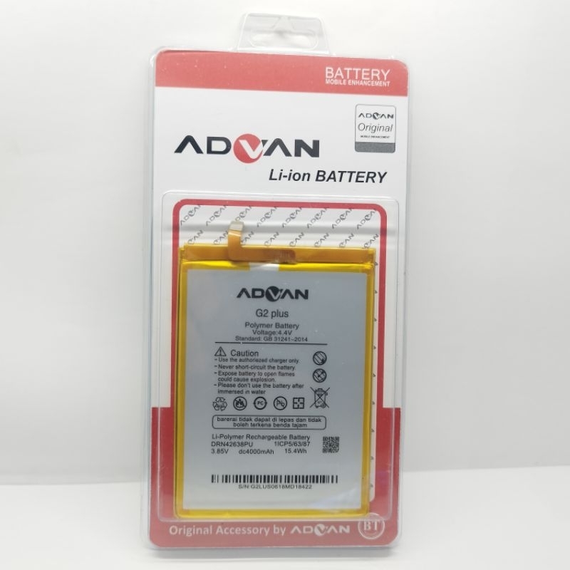 Baterai Advan G2 Plus ( perhatikan kode baterai hape anda ) 1 /CP5/63/87 Sebelum membeli harap pastikan dulu kode baterai di handphone anda sama dgn yg kami jual, agar tidak terjadi kesalahan tipe, dikarenakan merek hp semakin banyak terima kasih. cocok digunakan untuk Advan G2 Plus sebagai pengganti baterai Anda yang rusak atau sebagai baterai cadangan Anda murah dan berkualitas Polymer Battery Li-Polymer rechargeable battery limited charge voltage 4.4Vdc Nominal Voltage 3.85Vdc watthour 15.4Whr kapasitas 4000mAh ( tertulis di body baterai )