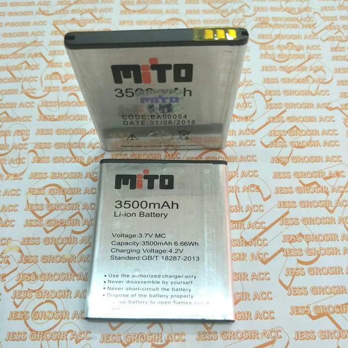 Description Product : * GB/T 18287-2013 * Kode Battery : BA-00054 * Capacity :3500mAh / 6.66Wh * Rated Voltage : 3,7V * Merek : MITO * Charger Voltage : 4,2V * Compatible : MITO ( A150 Fantasy Pocket , Others.......)
