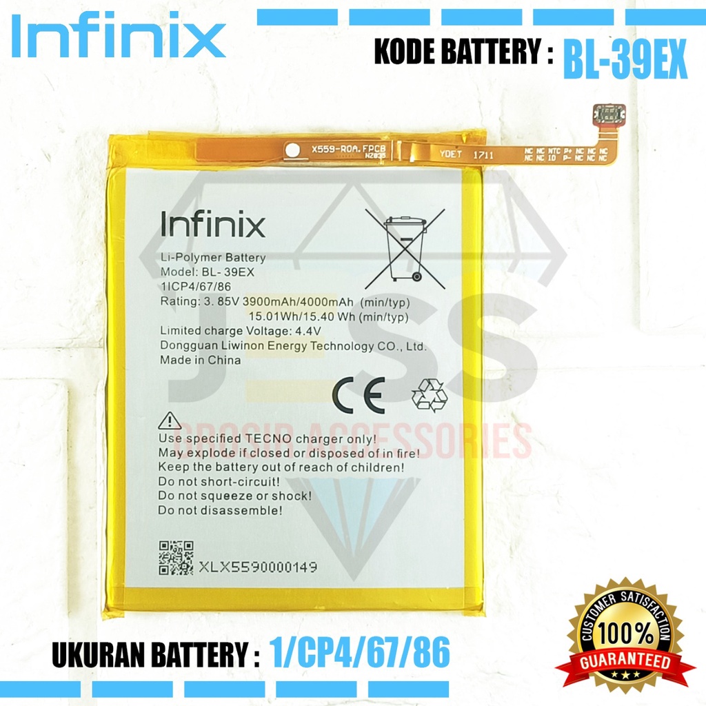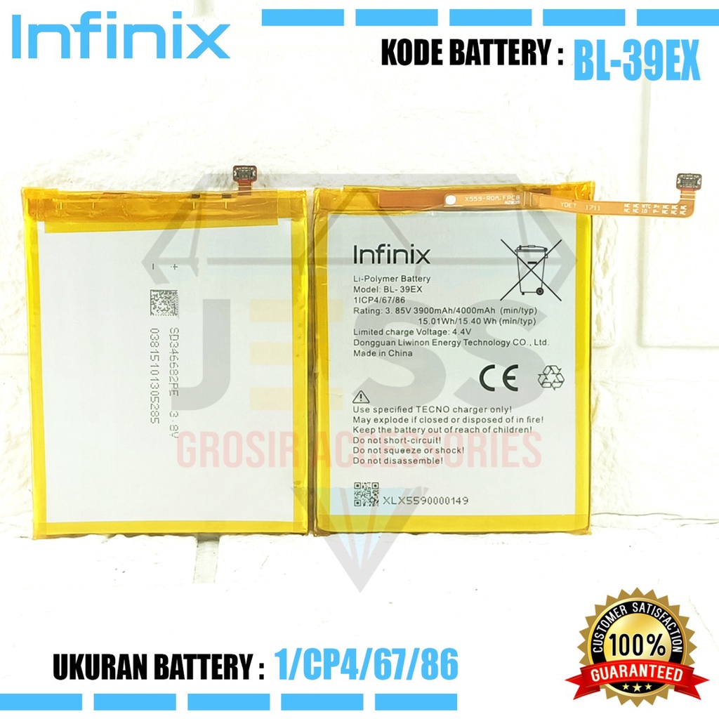 Deskripsi Produk : Merek : INFINIX Model : BL-39EX 1/CP4/67/86 Kualitas : Original Rated Voltage : 3.85V Rated Capacity : 3900mAh / 15.01Wh Typical Capacity : 4000mAh / 15.40Wh Charger Voltage : 4.4V Compatible : INFINIX ( HOT 5 - X559C - HOT 5 Lite - X559 ) OTHERS....