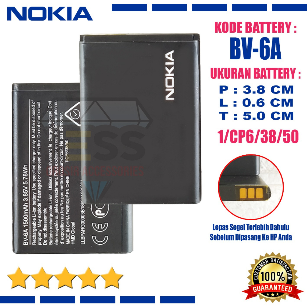 DESKRIPSI PRODUCT : 1/CP6/38/50 Merek : NOKIA Model : BV6A / BV-6A ( Perhatikan Kode Yang Tertera Di baterai Anda) Kualitas : Original Rated Voltage : 3.85V Capacity : 1500mAh / 5.78Wh Charger Voltage : 4.4V Compatible : NOKIA ● Nokia Pisang 8110 4G Lte Rebon Tahun 2019 - TA-1048 & TA-1059 & TA-1067 & TA-1071 & TA-107 ● Nokia 2720 Flip - 2720V & TA-1168 & TA-1170 & TA1295 Others....
