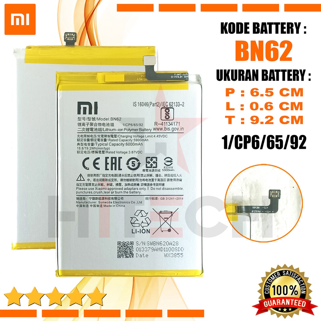 Description Product : 1/CP6/65/92 Rechargeable Li-ion Polymer Battery Kode : BN62 ( Perhatikan Kode Yang Tertulis di Baterai Anda) Kualitas : Original Rated Voltage : 3.87V Capacity : 5900mAh - 6000mAh / 18.8 - 19.2Wh Charger Voltage : 4.45V Compatible : XIAOMI (Xiaomi POCO M3 /Redmi Note 9 (4G)/ Redmi 9T (4G)) Others....