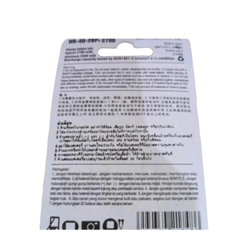 Baterai charger sanyo 2700mah AA -Voltase 1.2V -Ampere 2700 -Ni-Mh -Ukuran AA (Jam dinding) -harga 1pack (isi 4pcs) -1000x recharger -Made in Japan -Nichel Metal hydride battery -Superlattico Alloy EVO -bisa buat kamera dll