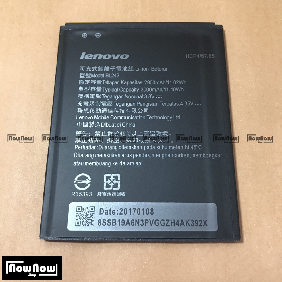 Detail produk: - Baterai Lenovo BL243 - Kapasitas baterai 3000 mAh (Li-ion Battery) - Baterai bisa langsung charger di HP (tidak perlu memakai charger desktop) - No Pairing (baterai bisa langsung digunakan) - No Back Door Cover (tidak perlu ganti casing belakang). - Dimensi baterai sama dengan original. - NowNow Shop memberikan garansi selama 2 Minggu sejak barang diterima sebagai jaminan kualitas. - Untuk lebih detail dapat melihat foto yang dilampirkan.