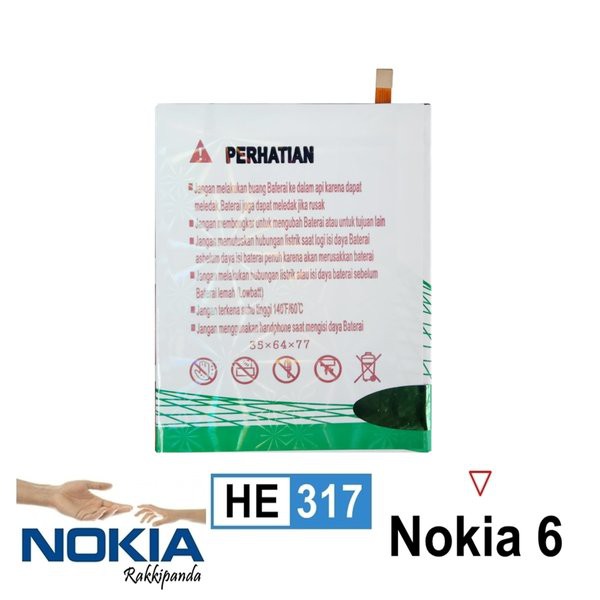 Baterai Nokia 6 4G Lte HE317 Double IC ProtectionSafety & High Quality BatteryLi-Po Temperature Fuse Control 2IC & SwitchesSlimmer, lighter cells contributes to the weight reduction and downsizing of portabe products. Rakkipanda Li-ion battery is ultra-slim and ultra-light than any other batteries by using high moleculer substances and also provides.Specification: Battery Code: HE317 ( Biasanya tertulis pada body baterai ). Merk: Rakkipanda. Voltage Ranges: 3.7-3.8V / LCV 4.2V. Capacity Label: 4500mAh. Warranty: 12 Months. Compatible: Nokia 6 4G Lte,..Others.Battery Status: Plug and Play / No Pairing ( Langsung pakai ). Full Cell ( Material Padat 99,9% Tanpa Rangka). No Back Door Cover ( Tidak perlu ganti casing belakang ). Size & Capacity (+-)= Original Battery ( Bundling HP).Warning: Do not dispose the battery in a fire as it may explode, battery may also explode if damaged. Do not disassemble or modify the battery, or for any other purpose. Do not expose the battery to liquid or subject to strong mechanical shocks. Do not expose to high temperatures 140F/60C. Do not short-circuit the battery, accidental short-circuit can occur when a metalic object such as coin, clip, or pen causes direct connection of the positive (+) and negative (-) terminals of the battery short-circuiting the terminals may damage the bettery the battery or the connecting object.
