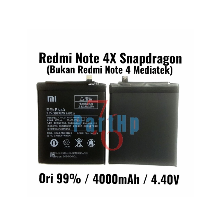 Spesifikasi baterai : - Merk : Xiaomi. - Tipe baterai : BN43. - Kualitas : Ori 99%. - Untuk Hp : Xiaomi Note 4X Snapdragon ( Bukan Untuk Mediatek ). - Kapasitas label : 4000mAh. - Tegangan : 4.40V. - Garansi : 1 minggu sejak barang diterima (silakan baca persyaratan di bawah).