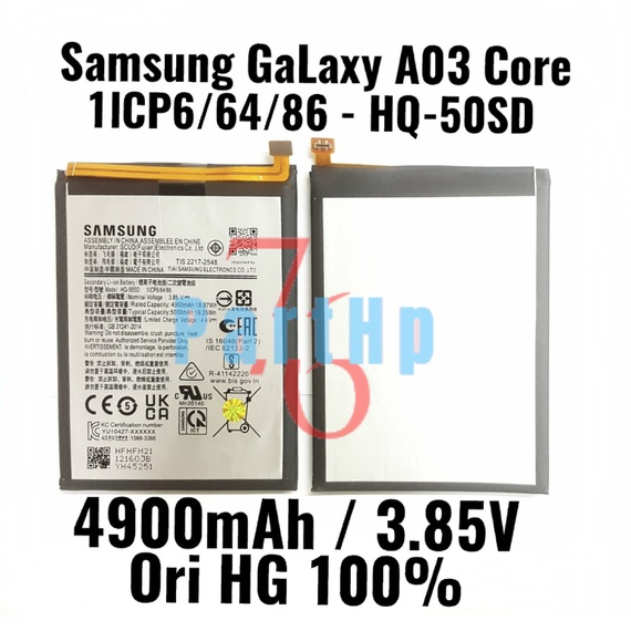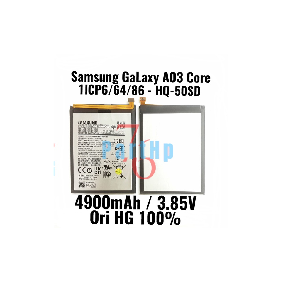 Spesifikasi baterai : - Merk : HG - Tipe baterai : Ori HG 100% 1iCP6 / 64 / 86 / HQ / 50SD. - Kualitas : Ori Samsung. - Untuk Hp : Samsung Galaxy A03 Core. - Kapasitas label : 4900mAh. - Tegangan : 3.85V. - Garansi : 1 minggu sejak barang diterima (silakan baca persyaratan di bawah).