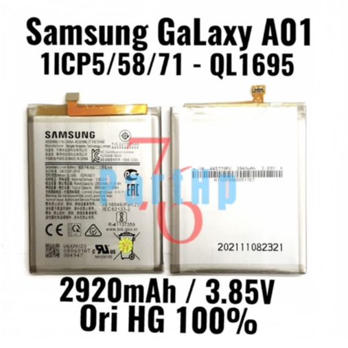 Spesifikasi baterai : - Segel : HG. - Kualitas : Original 100%. - Untuk Hp : Samsung Galaxy A01. - Kapasitas label : 2920mAh. - Tegangan : 3.85V. - Garansi : 1 minggu sejak barang diterima