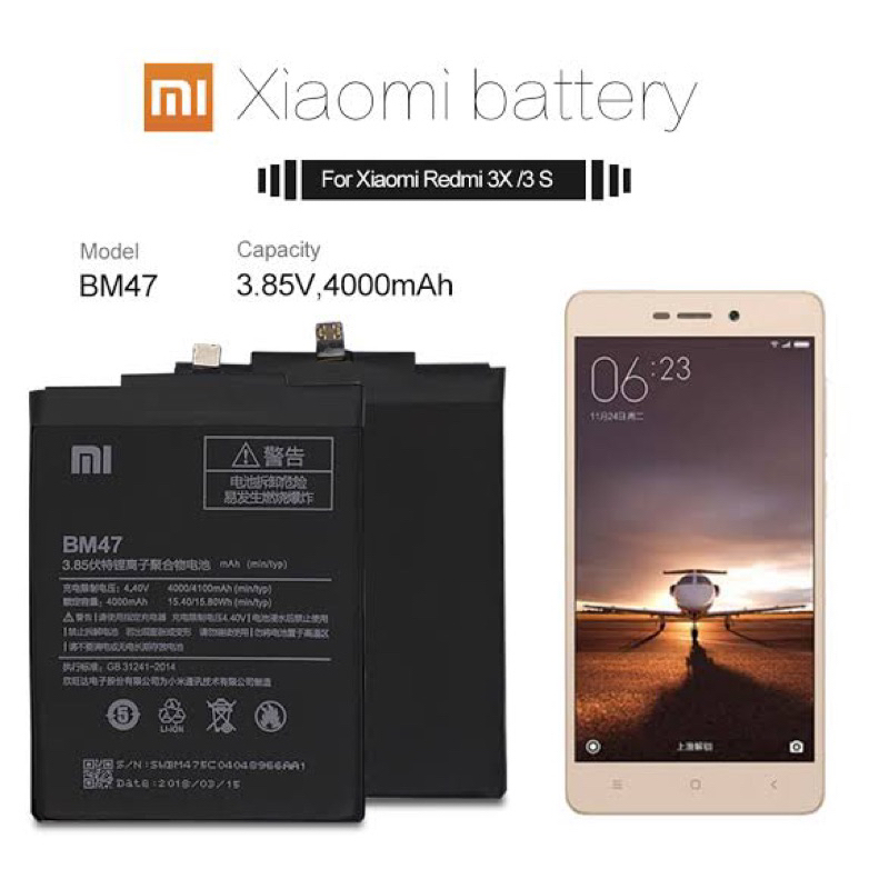 Specification: - bahan: Li-polymer baterai cell dengan battery label - Kode Baterai: BM47 - Voltage: 3.85 - kapasitas: 4000mAh - Merek: xiaomi - Limited Charge Voltage : 4.4 V