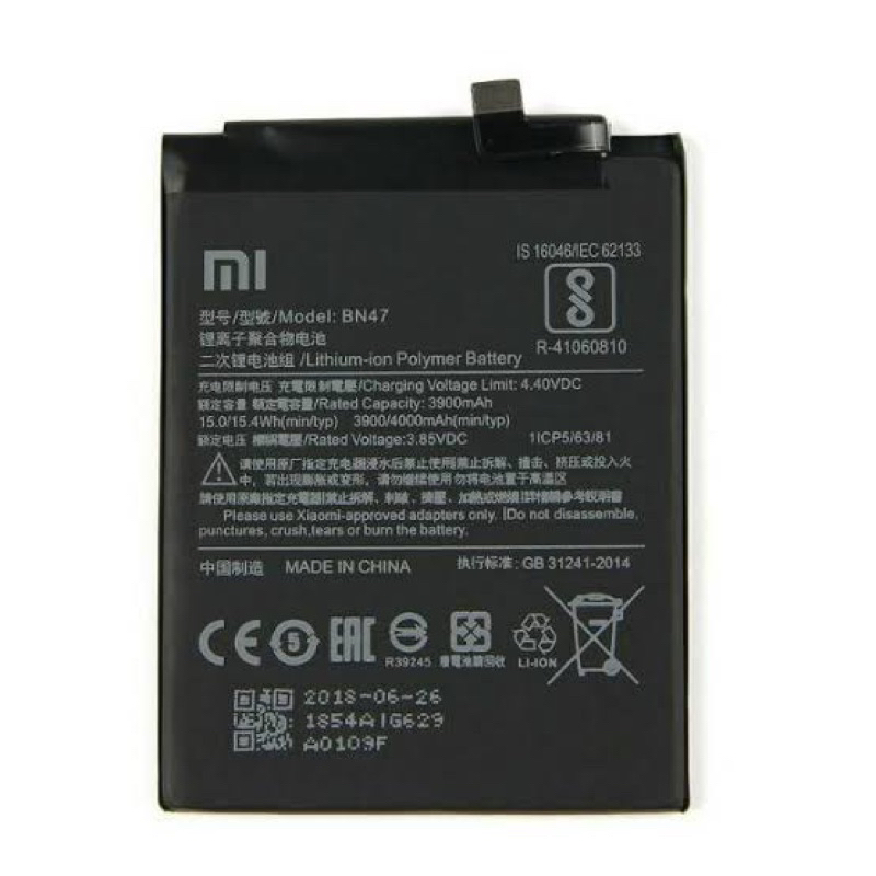 Specification: - bahan: Li-polymer baterai cell dengan battery label - Kode Baterai: BN47 - Voltage: 3.85V - kapasitas: 3900mAh - Merek: xiaomi - Limited Charge Voltage : 4.4 V