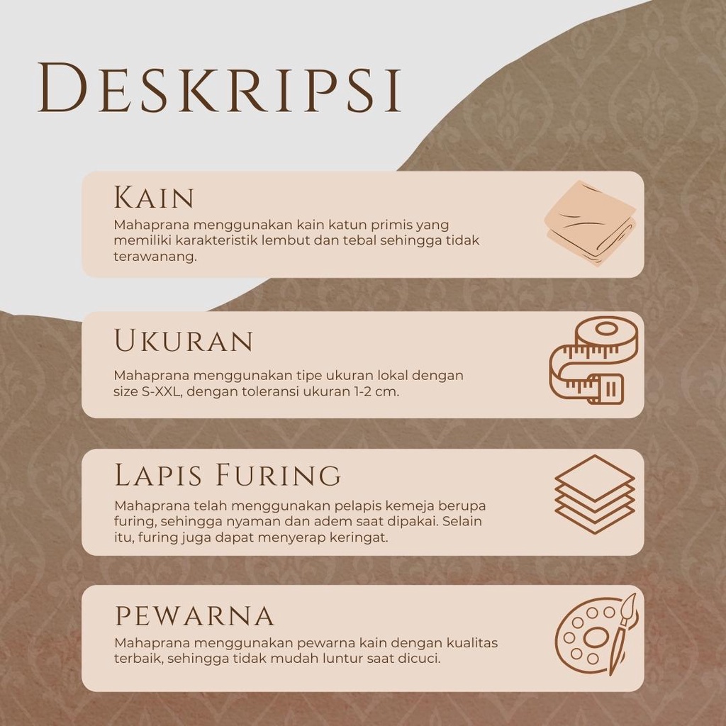 Note: Jenis gadget dan level pencahayaan menyebabkan terdapat perbedaan pada warna dilayar gadget anda dan fisik kemeja saat diterima, tetapi ribuan customer sudah yakin dengan kualitas BATIK MAHAPRANA