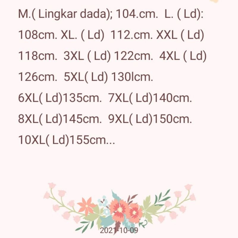 Ukuran baju size M. 102-104 Ukuran baju size L. 104-108 Ukuran baju size XL. 108-112 Ukuran baju size XXL. 116-118 Ukuran. XXXL; LD:; 122cm. Ukuran.4XL ;.LD;: 126.cm. Ukuran 5XL. :; LD : 130cm. Ukuran. 6XL. : LD .:; 135cm. Ukuran .7XL. :L D . 140cm . Ukuran :. 8XL. ;: LD. ;: 145cm . Ukuran. :; 9XL. ;: .LD :; . 150cm . Ukuran. : 10 XL. L D. ;: 155cm .