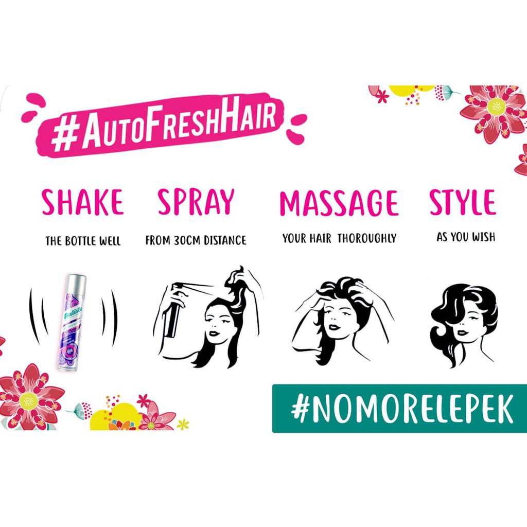 Cara Pakai: SHAKE - Kocok Batiste Dry Shampoo SPRAY - Semprotkan Batiste Dry Shampoo ke akar rambut dengan jarak 30 cm Massage - Pijat lembut menggunakan ujung jari untuk memastikan akar rambut terkena sepenuhnya. STYLE - Setelah itu, sisir rambut untuk menyingkirkan sisa residu dan tata rambut sesuai selera.