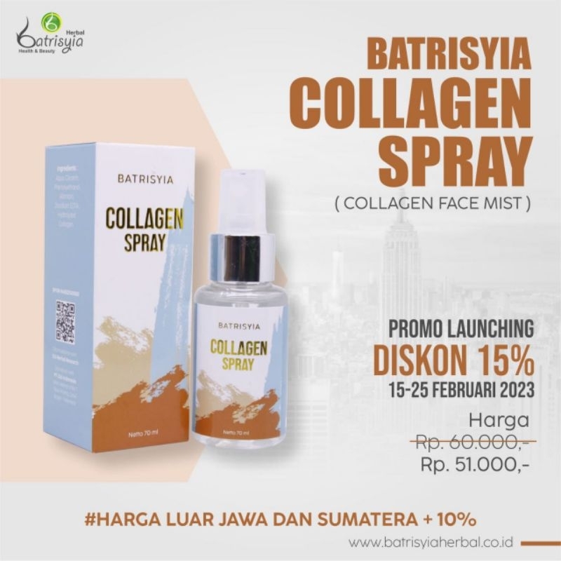 BATRISYIA Collagen Spray (Face Mist Spray) merupakan collagen dalam bentuk spray yang mengandung Hydrolyzed Collagen yang menyamarkan garis halus, mencegah tanda-tanda penuaan dini dan merawat keremajaan kulit. Kandungan Allantoin membantu mengurangi peradangan kulit.