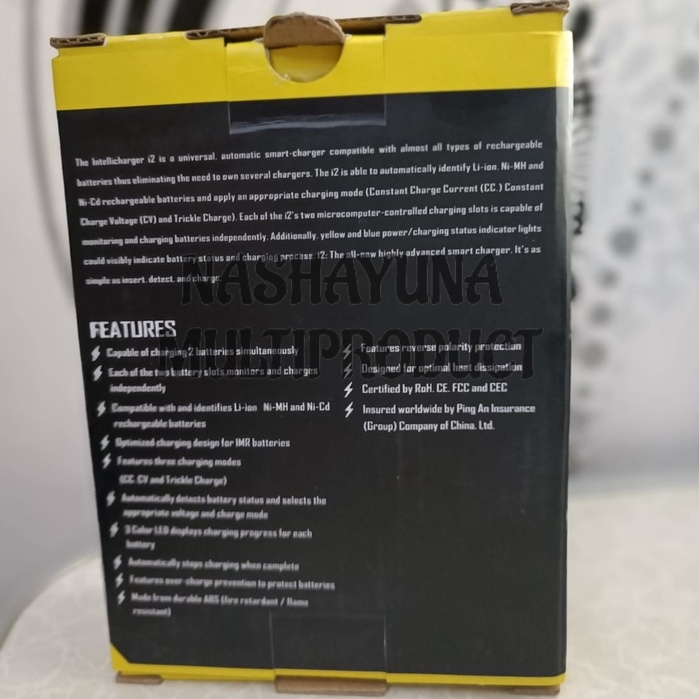 INTELLICHARGER I2 SPESIFIKASI: INPUT : AC 100-240V 50/60HZ 0.25 (MAX) DC 5V 1A OUTPUT (MAX) : 4.2 -/+ 1% 1A*2