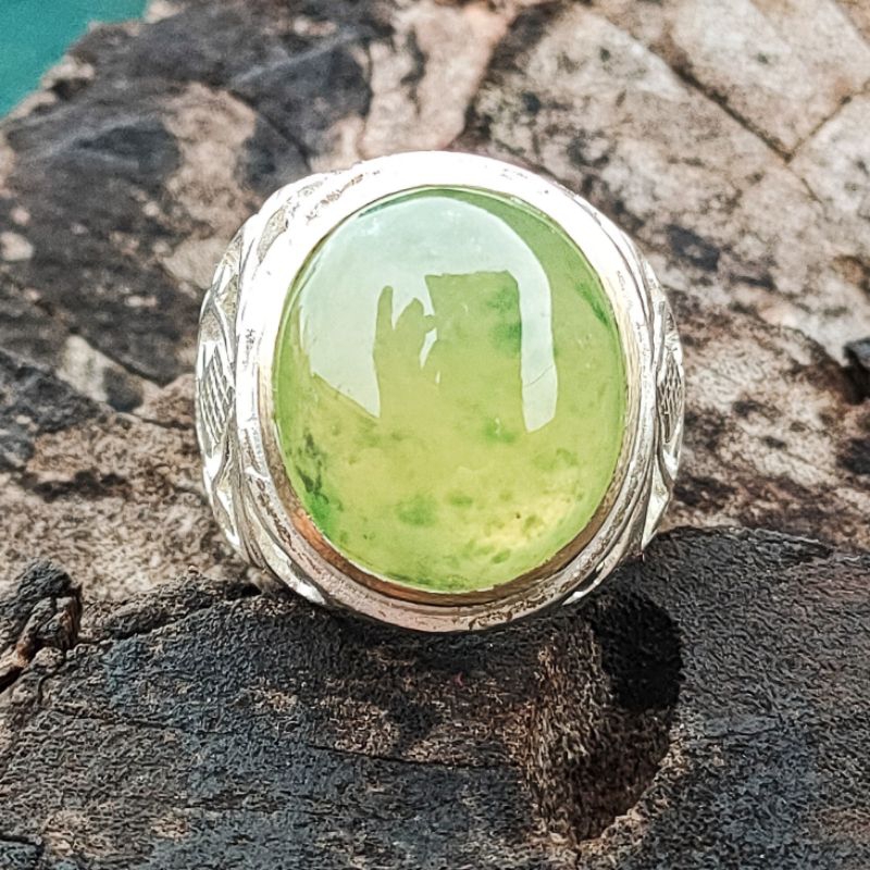 BISMILLAH ID : NATURAL IDOCRASE Market Name : LUMUT SUNGAI DAREH PUCUK PISANG KODE 02594 Origin : Sumatera Barat (IND) Diameter Stone : 16*14*7 mm (Est) Size Ring: 7,5 Type Ring : Alpaca Super Skala Kekerasan (Mohs) : 6-6,5 Cut : Chabocon Shape: Oval