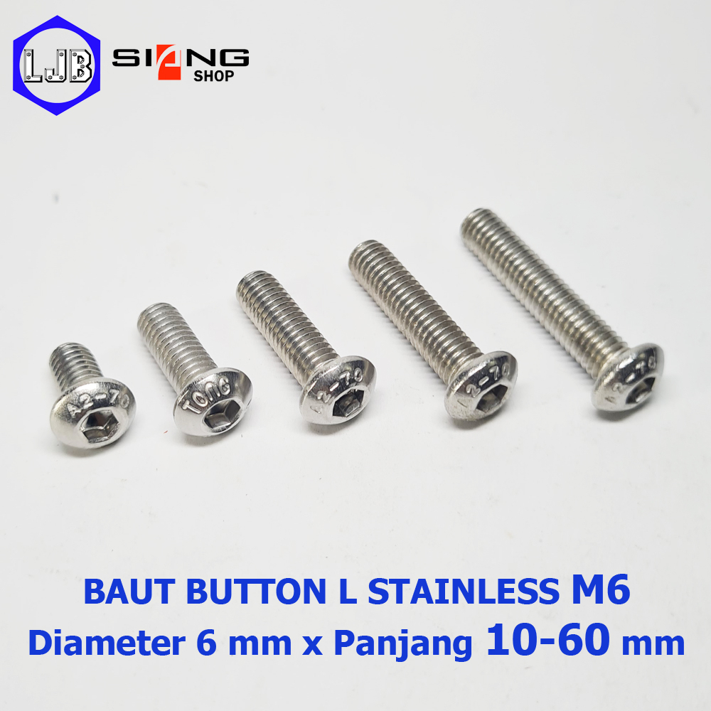 Baut Button L M6 Stainless 304 A2-70 Panjang 10 sd 60 mm - Diemeter ulir = 6mm (baut 10an) - Diameter Kepala = 10.2mm - Ukuran Kunci L = L4 - Panjang Baut 10 - 60 mm (pilihan di variasi) - Pitch = 1.00 - Kunci = L - Harga perbiji terima kasih
