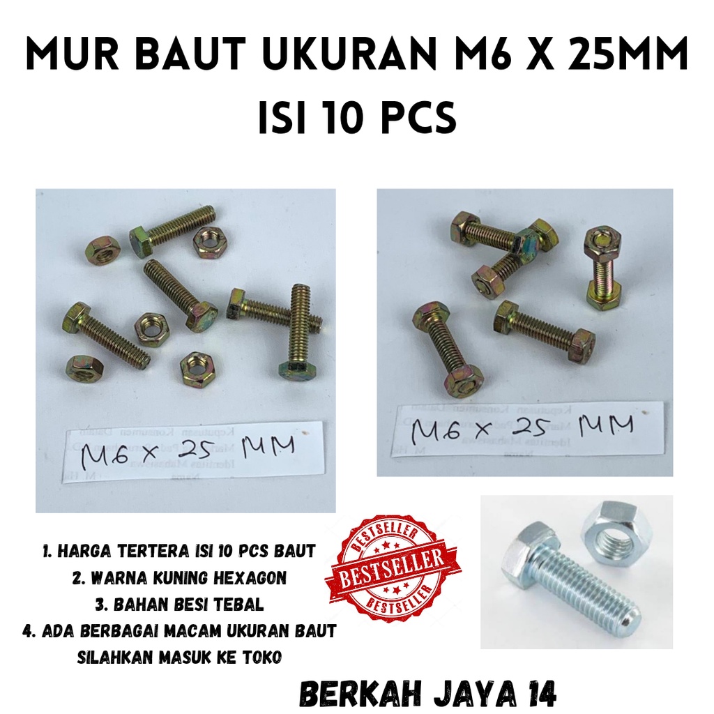 Perlengkapan Rumah > Perkakas > Perkakas Lainnya > BAUT M6X25 MM ISI 10 PCS WARNA KUNING HEXAGON HEX BMK MUR BAHAN BESI TEBAL HARGA MURAH BERKUALITAS PROMO DISKON TERLARIS