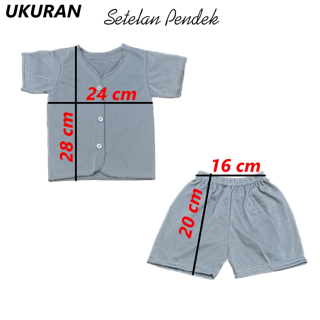 * 3 SET dapat 3 pcs Baju Bayi Pendek dan 3 pcs Celana Pendek * Bahan dari katun PE * Aman untuk kulit bayi * Bisa untuk bayi laki-laki maupun perempuan * Perkiraan Umur 0 - 3 bulan * Ukuran BAJU : Lebar baju 24 cm, Panjang baju 28 cm * Ukuran CELANA : Lebar Karet 15 cm (sebelum ditarik), Panjang celana 20 cm * Umur hanya Perkiraan saja bukan menjadi patokan. Mohon Bunda ukur dulu baju yg biasa dipakai adik sebelum membeli, karena beda anak beda ukuran, TERIMA KASIH