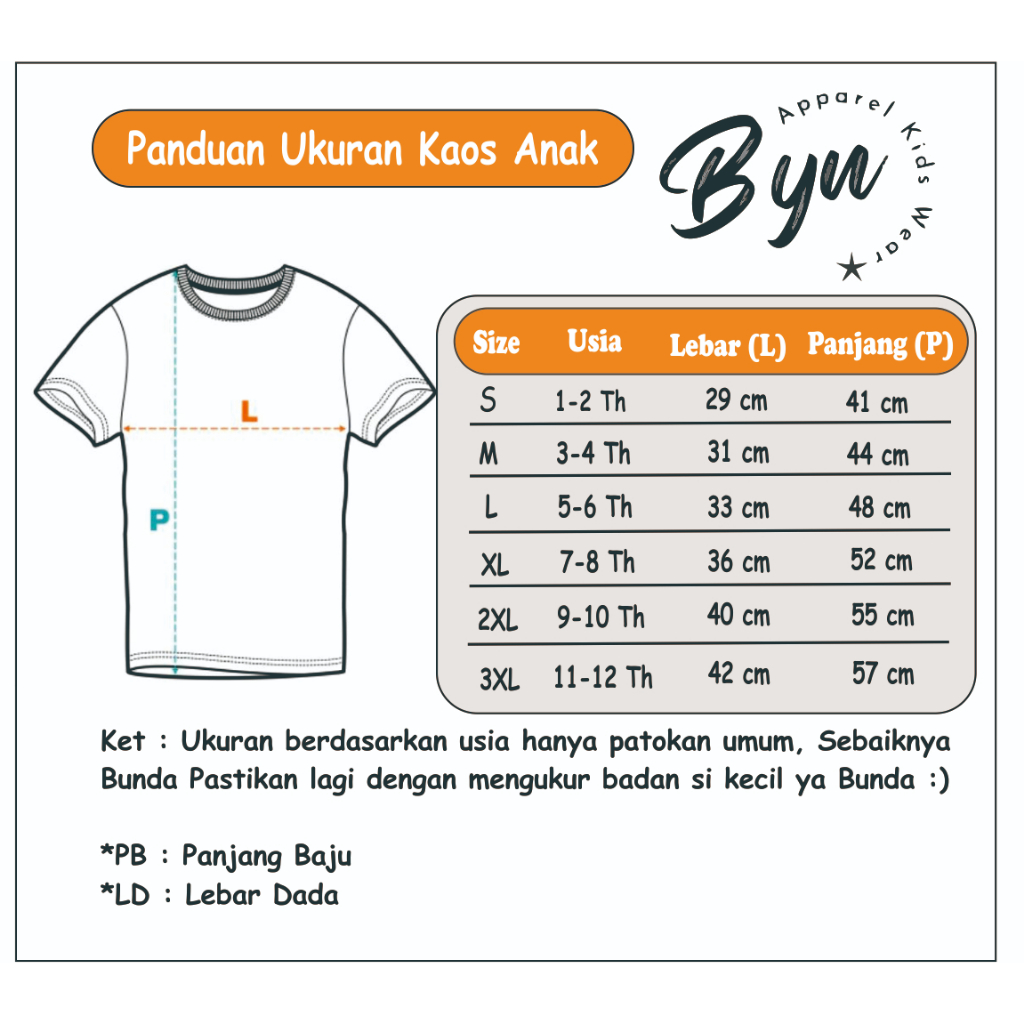 ====== Detail Ukuran ====== SIZE = Lebar dada x Panjang Baju ( Perkiraan Umur ) S = L : 29, P : 41 ( 1 - 2 TAHUN ) M = L : 31, P : 43 ( 3 - 4 TAHUN ) L = L : 33, P : 48 (4 - 5 TAHUN ) XL = L : 37, P : 52 ( 5 - 7 TAHUN ) XXL = L : 40, P : 55 ( 7 - 10 TAHUN ) XXXL = L : 42, P : 57 ( 10 - 12 TAHUN ) * Toleransi Ukuran 1-2 cm.
