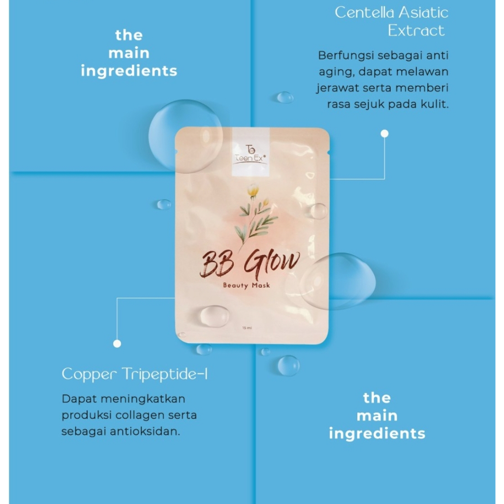 Ingredients BB Glow Beauty Mask : 1. Centella Asiatica Extract berfungsi sebagai anti aging, dapat melawan jerawat, serta memberikan rasa sejuk pada kulit
