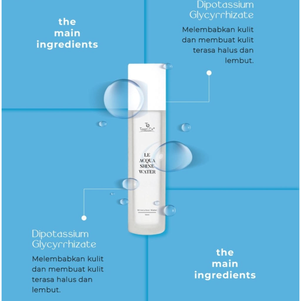 Ingredients Le Acquashine Water : 1. Dipotassium Glycyrrhizate melembabkan kulit & membuat kulit terasa lebih halus & lembut