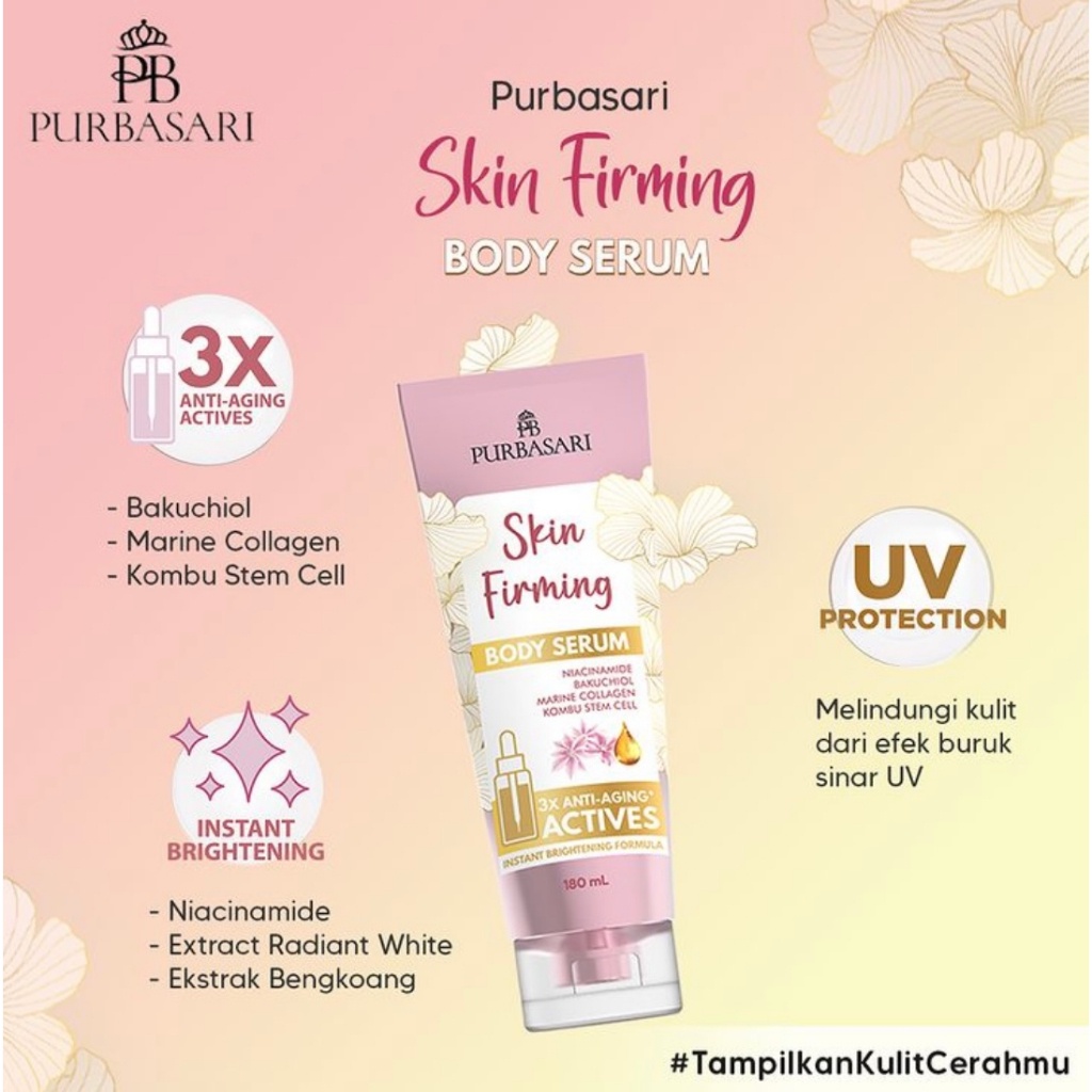 - Purbasari Skin Firming Body Serum Dengan aroma floral yang segar dan tahan lama, Purbasari Skin Firming Body Serum membantu mengurangi tanda penuaan dan memberikan efek instant brightening pada kulit.