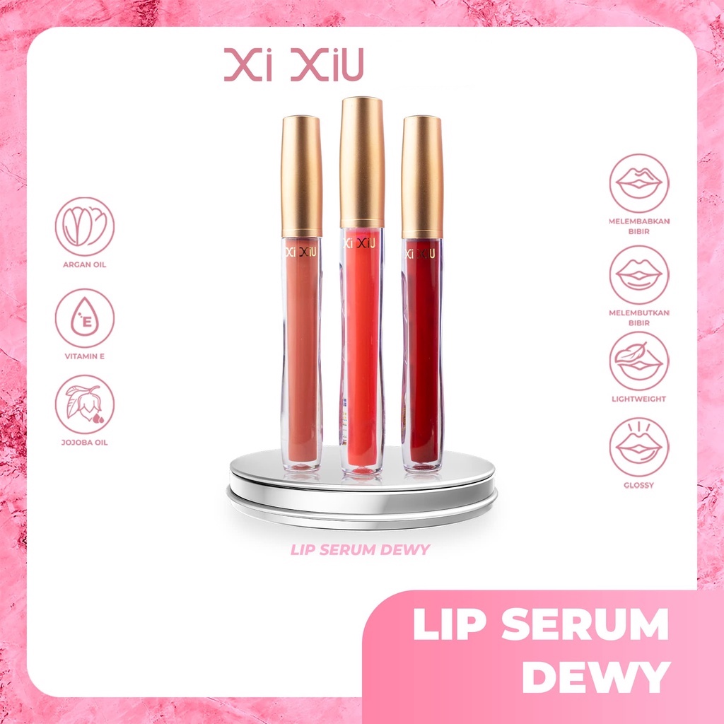 XI XIU LIP SERUM DEWY with Argan Oil, Vitamin E dan Jojoba oil di perkaya dengan formula Lightweight yang bermanfaat untuk membuat kulit bibir terasa lebih lembut, lembab dan tidak kering. memberikan efek glowing dengan sentuhan Buildable Color. - Wet & Dewy Effect - Buildable Color - Lightweight - MOISTURIZING - GLOSSY