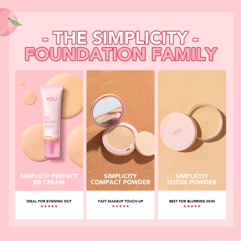 YOU Simplicity Perfect BB Cream memberikan tampilan wajah lembut dengan hasil akhir semi-matte sekaligus membantu melembapkan dan meratakan warna kulit. 🍑 8H Long Lasting Memberikan hasil akhir semi-matte dengan hasil tahan lama 🍑 Hydrating & Moisturizing 4D Hyaluronic Acid & Ekstrak Peach Blossom yang kaya antioksidan untuk membantu melembapkan & menjaga kulit tetap terhidrasi 🍑 Witch Hazel extract Membantu mengontrol sebum berlebih & menyamarkan tampilan pori pada kulit