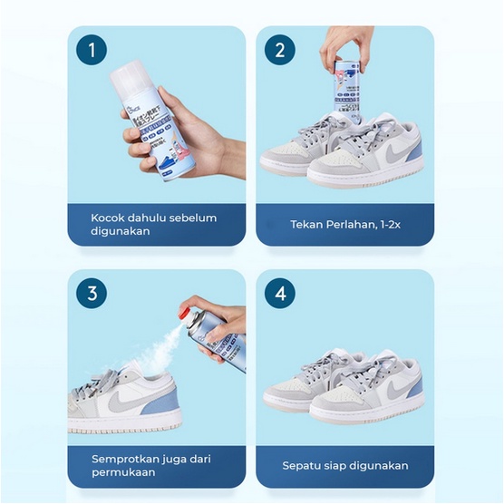 2. Secara Internal kocok terlebih dahulu, terbalikkan botol lalu tancapkan kepala pompa semprotan berwarna merah ke dalam sepatu dan tekan