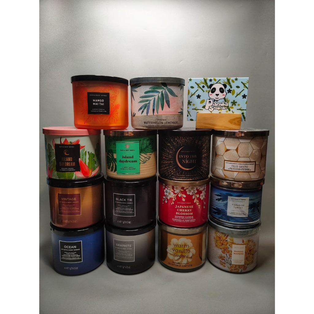 Three Wick candles from Bath and Body Works.. lilin dengan 3 sumbu, mampu bertahan berjam-jam dengan aroma yang menyegarkan. cocok untuk aromatheraphy dirumah... berat netto 411 gr, berat total 700 gr dengan glass packagingnya, total packaging 1 kg harganya murah meriah... Hanya jual barang ORI, No reject. Harga per PCS