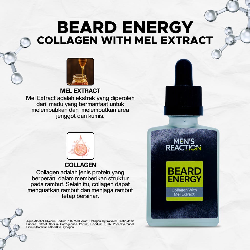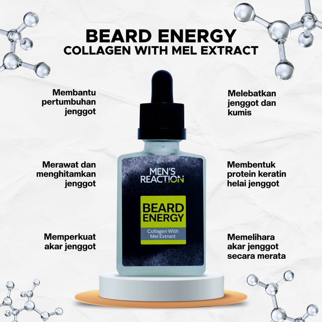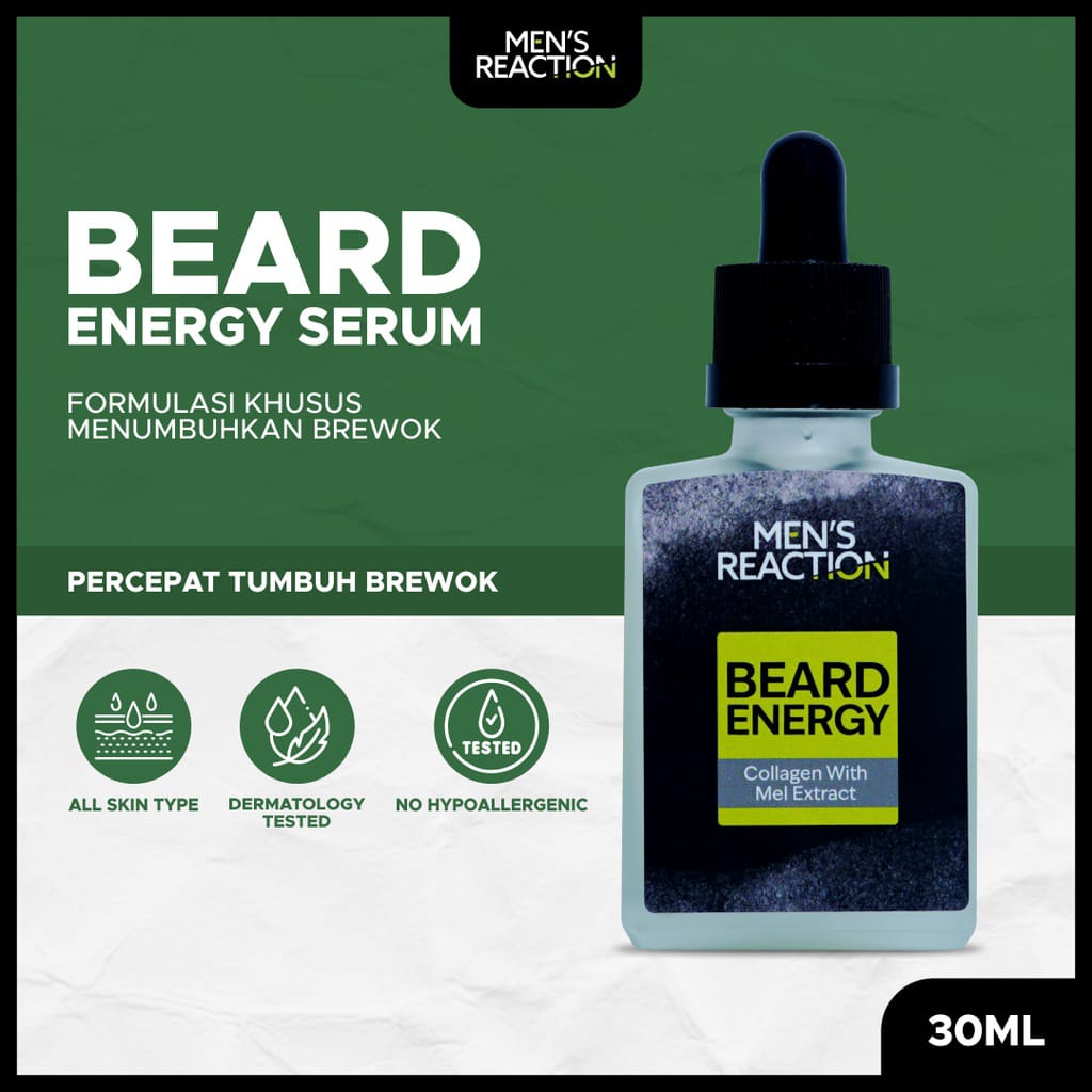 MENS REACTION Beard Energy produk pria yang dikhususkan untuk merawat jenggot maupun kumis pria. Mengandung bahan alami yang dapat membantu untuk pertumbuhan jenggot dan kumis, menghitamkan jenggot dan kumis, serta memelihara dan memperkuat akar brewok dan rambut pada jenggot maupun kumis.