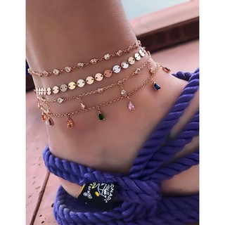 LRC Gelang Kaki Fashion Gold Alloy Disc Color Rhinestone 4 Layer Anklet D09309