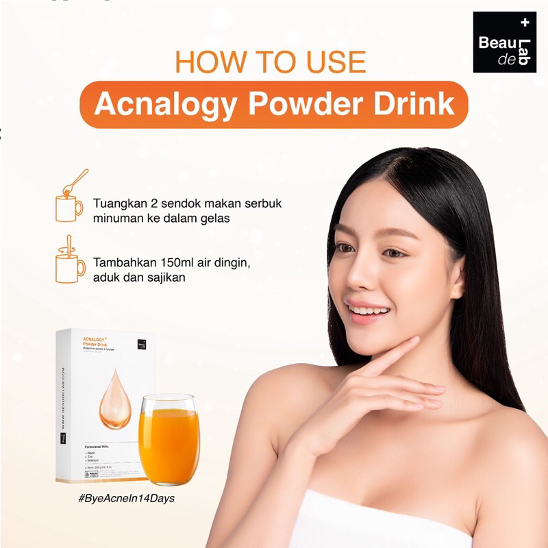 - Ambil 2 sendok Beaudelab Acnalogy Powder Drink & aduk ke dalam 150 ml air dingin - Minumlah 1-2 kali sehari agar mendapatkan hasil yang maksimal