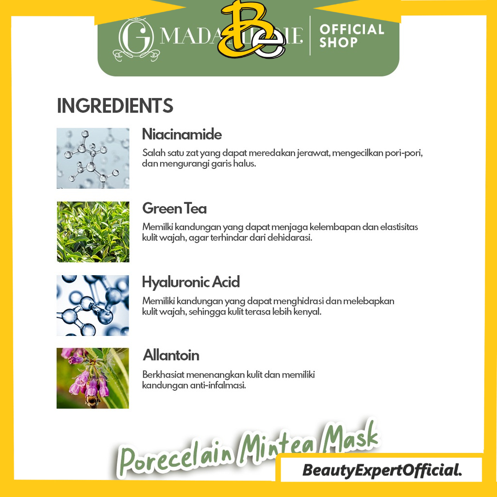 Madame Gie Porecelain Mintea Mask merupakan masker bilas yang mengandung - Green Tea - Niacinamide - Acetyl Glucosamine - Hyaluronic Acid - Allantoin